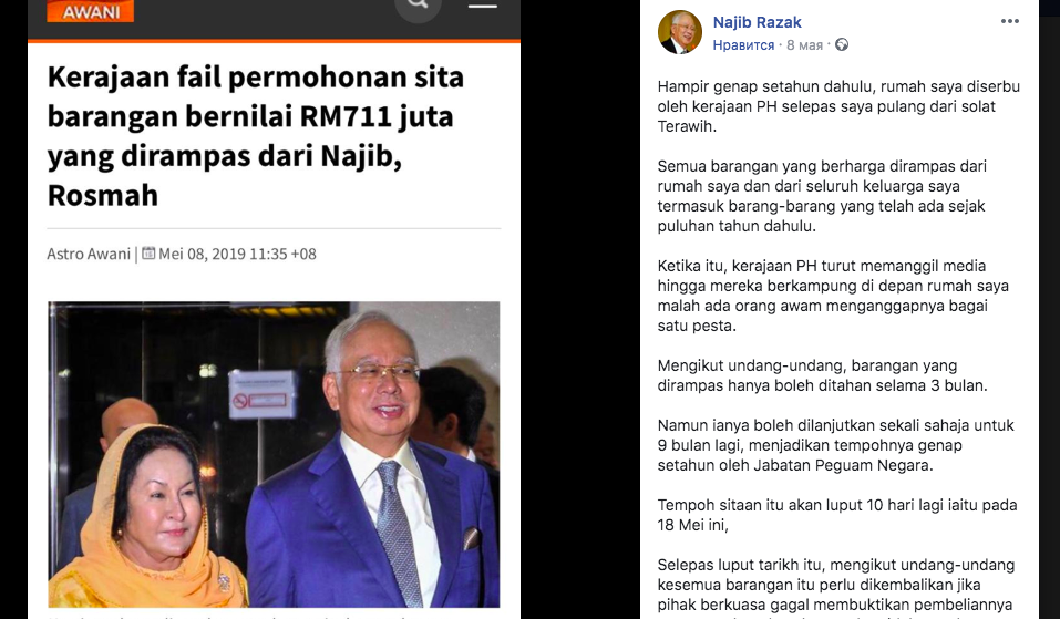 Судебное разбирательство по этому делу началось в апреле 2019 года и продолжается до сих пор. Наджиб Разак категорически отметает все обвинения. Как раз в качестве очередного аргумента он и опубликовал пост в Facebook, где утверждает, что ювелирные изделия и предметы роскоши, конфискованные у него дома, фактически принадлежали его дочери, а не ему. (Кстати, при обыске в домах господина Разака и его жены Росмы Мансор было конфисковано 72 чемодана с деньгами и драгоценностями, а также 284 сумки известных брендов).