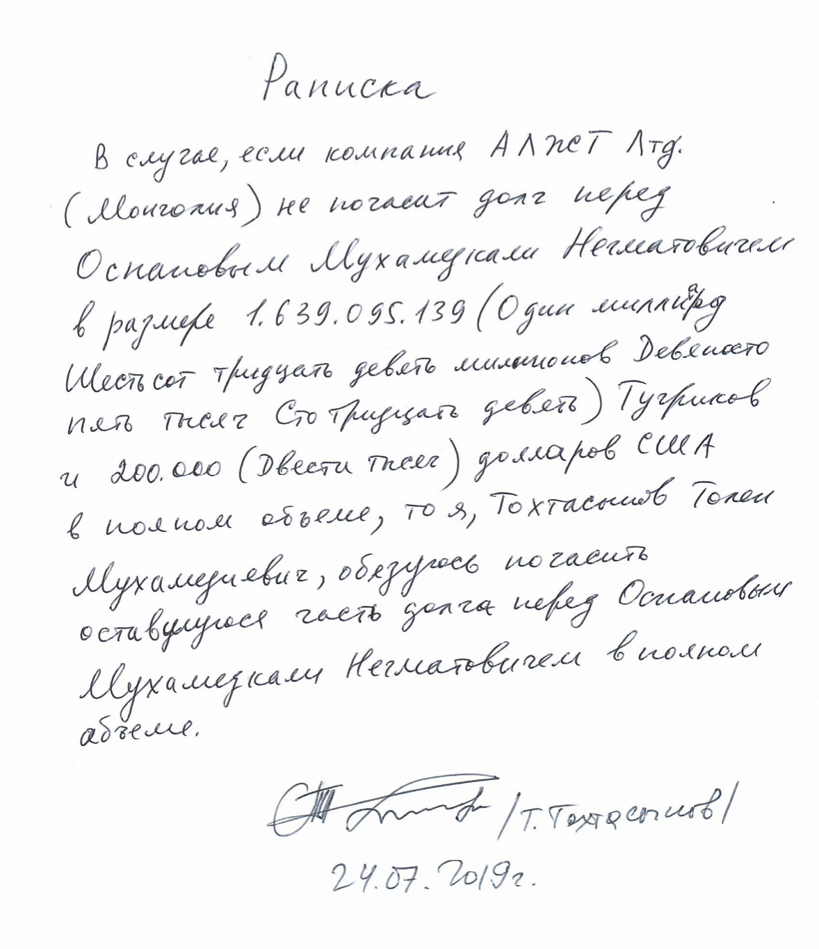 Предметом для данного разбирательства между истцом и ответчиком стал долг Тохтасынова Оспанову.
