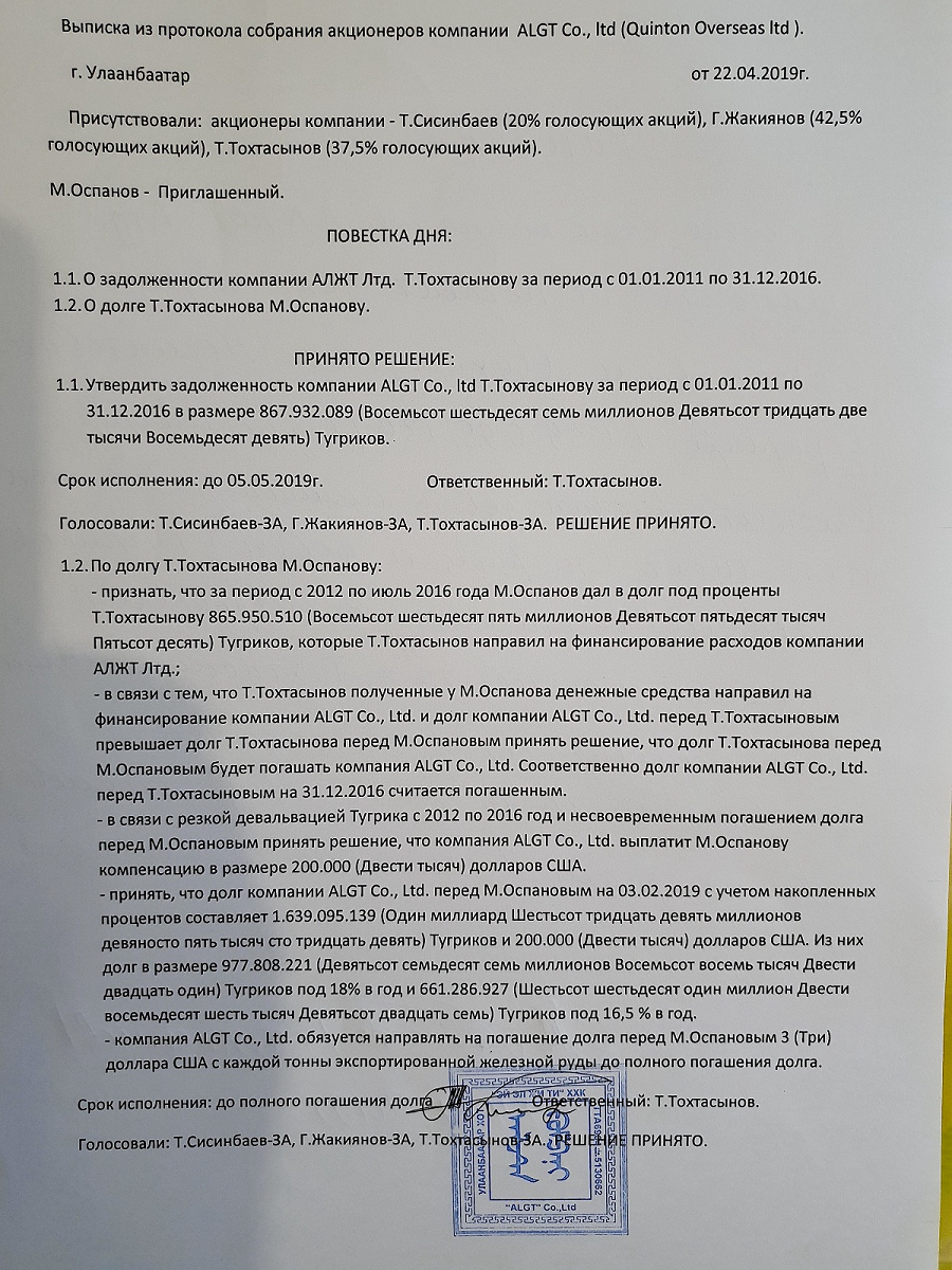 «Третье лицо Сисинбаев Т.М. пояснил, что в 2007 году Тохтасынов Т.М. создал компанию, предложил принять участие в компании, на что он согласился и купил 25% доли. Однако в последующем узнал, что не является участником 25% доли компании, тогда как никакой доверенности на продажу и передачу доли компании никому не выдавал, в связи с чем предъявил претензии Тохтасынову Т.М. В апреле 2019 года состоялась встреча по вопросу долга перед Оспановым М., где выяснилось, что в 2010 году доли участников компании проданы новому участнику компании Quinton Overseas Ltd».
