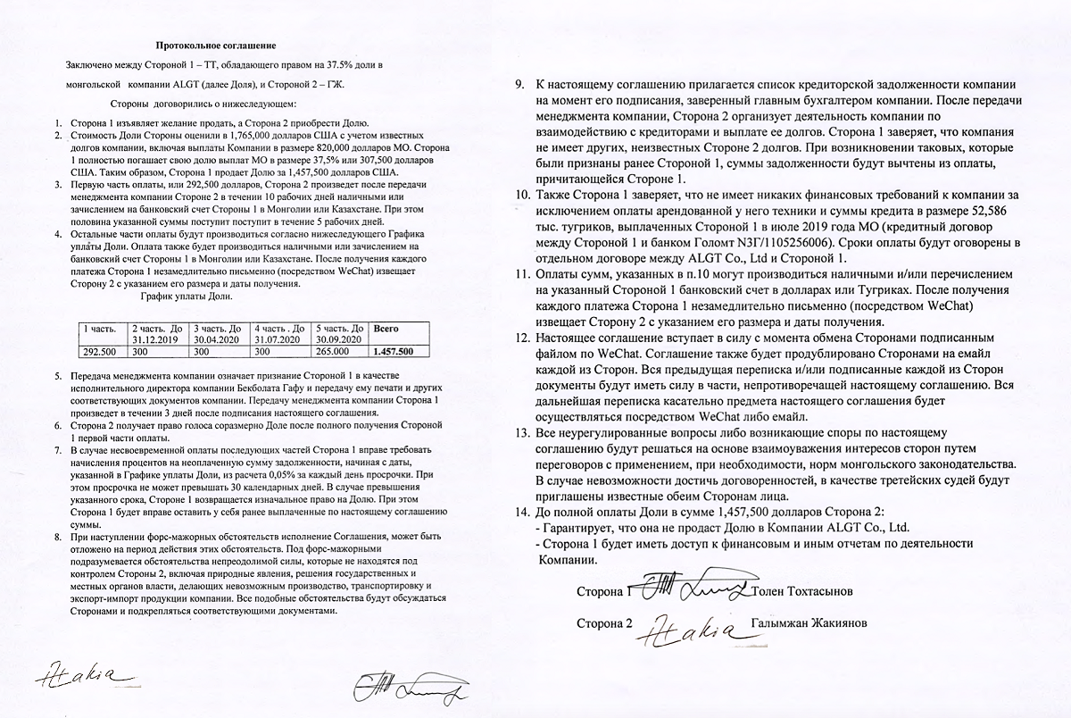 Сегодня мы публикуем документы, которые третья сторона, то есть Тагир Сисимбаев и Галымжан Жакиянов, попросили признать недопустимым доказательством. А позднее опубликуем и переписку участников конфликта – сразу скажем, что она очень информативна. (Документы взяты нами из переписки участников конфликта, имеющейся у нас в наличии в оригинальном формате — мэйлов, то есть их подлинность легко устанавливается).