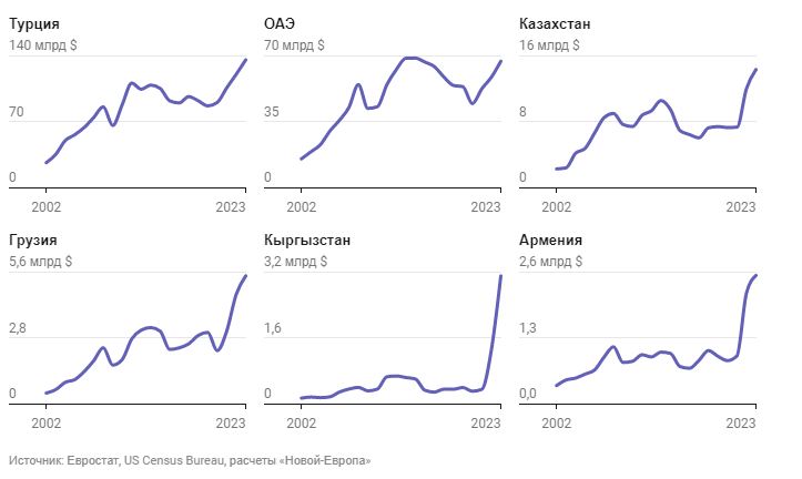 Суммарно страны Балкан, Кавказа и Центральной Азии, а также Турция и ОАЭ за 2022–2023 годы нарастили импорт на 133 млрд долларов. Частично это увеличение может быть связано с собственным экономическим ростом этих стран или другими факторами. ВВП Турции, Арабских Эмиратов и Казахстана активно рос в 2022–2023 годах. Тем не менее 133 млрд долларов было бы достаточно, чтобы полностью компенсировать все «потери» России.
