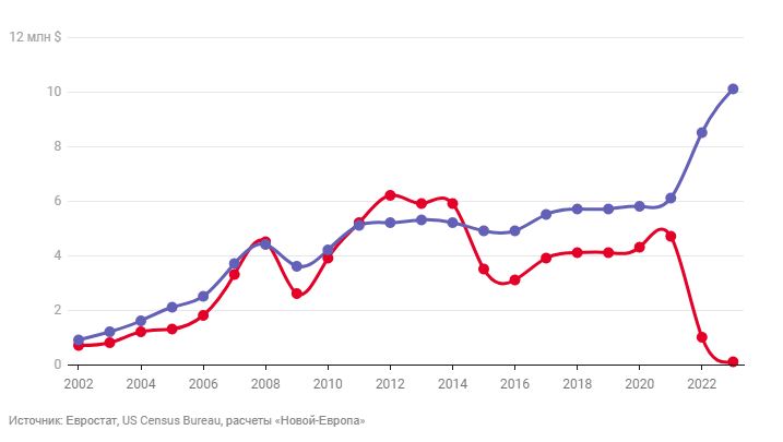 В 2022–2023 годах ее импорт из ЕС и США из-за санкций снизился на меньшую сумму ― 114 млрд долларов.