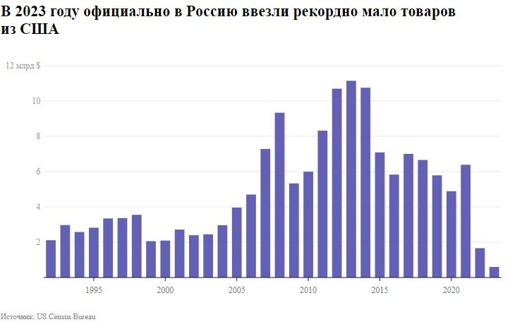 После начала войны торговые отношения не просто испортились, а почти обнулились. В 2023 году из США в Россию напрямую привезли товары всего на 600 млн долларов. Уровня ниже не было и в 1990-е.
