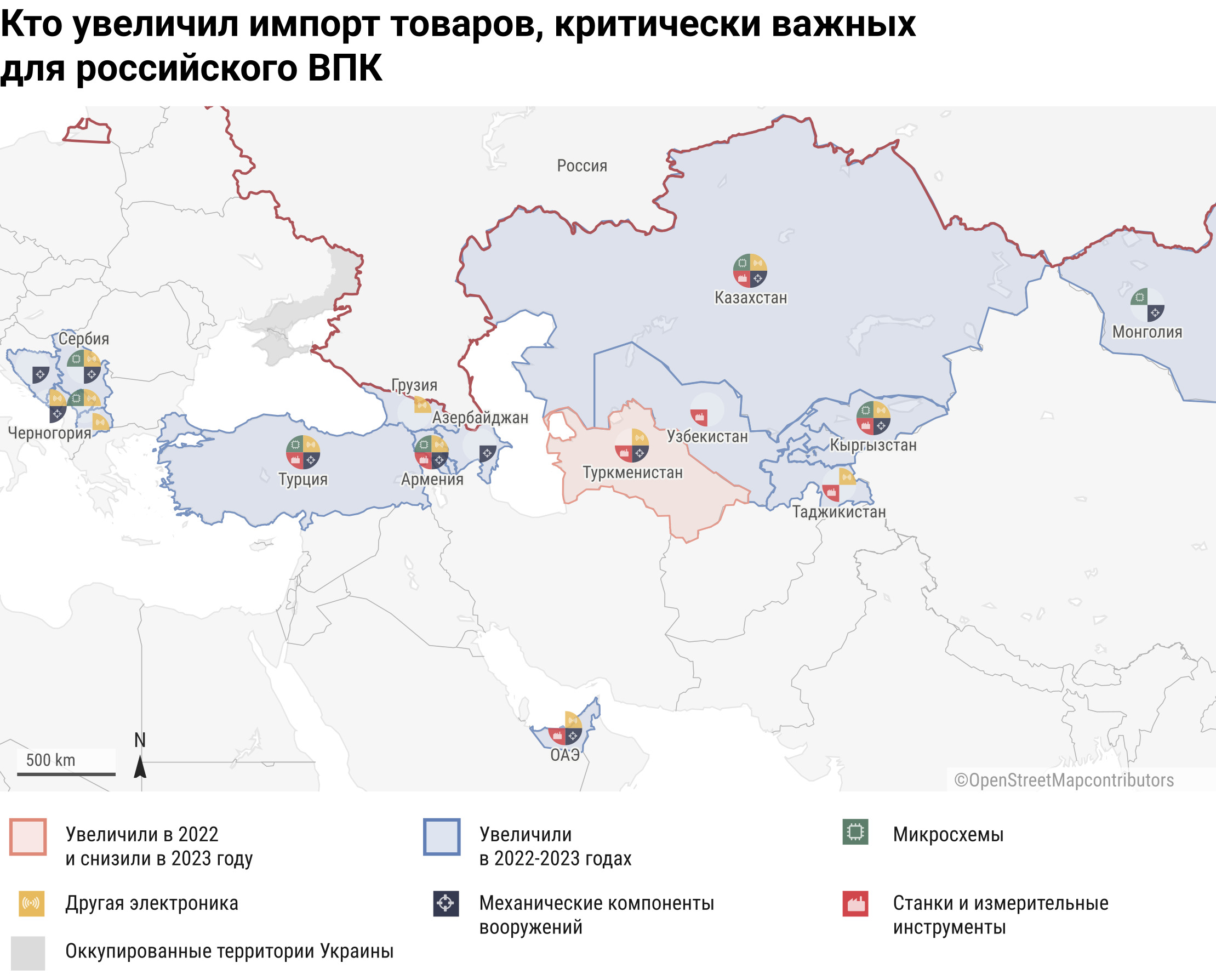 Важно отметить: мы не можем точно определить, какая доля от 6 млрд долларов поставок товаров двойного назначения приходится на серый импорт в Россию. В 2023 году многие страны — соседи России резко увеличили оборонные бюджеты: Армения (из-за войны в Нагорном Карабахе), Молдова, Турция, Казахстан. Поэтому такой рост может быть связан и с собственными потребностями стран в оружии. Не говоря о том, что такие товары ― микросхемы, станки ― используются и в мирных целях.
