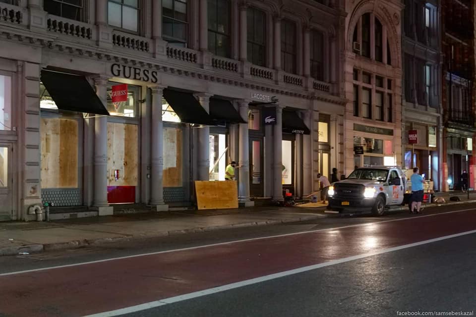 Была куча машин из Нью-Джерси, Пенсильвании и даже из Мэйна добрались. Впервые увидел грабителей на дорогих тачках. Люди подъезжали на Мерседесах за 100 штук и совершенно спокойно шли брать одежду, залезая внутрь через разбитые витрины и набивая товаром салон и багажник. Владельцы некоторых магазинов спешно пытались заколачивать окна, но боюсь, что это не сильно помогло. Разгоряченная успехом толпа отдирала фанеру, била стекла и спокойно лезла внутрь. Единственный магазин который нанял крепких охранников это «Найк». Даже интересно, помогло им это или нет.