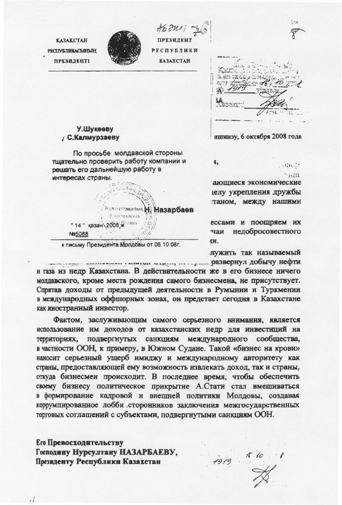 Проблемы в казахстанском бизнесе у Стати начались в октябре 2008 года после личного послания президента Молдавии Владимира Воронина Нурсултану Назарбаеву. Воронин готовился к Парламентским выборам и хотел лишить своих конкурентов финансовой поддержки. В своем письме он обвинил Стати не только во вмешательстве в молдавские дела, но и в поддержке международного терроризма (тогда это было еще модно и актуально). В реальности же, судя по всему, Воронин и его окружение боролись не с терроризмом и даже не со Стати, а с Петром Лучинским – бывшим президентом Молдовы, который поддерживал со Стати тесные политические и деловые связи.