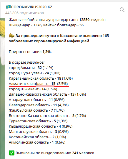 Но что любопытно: по сводкам за минувшие сутки количество зараженных увеличилось на 15 человек, что составило прирост 3,5%, и 9 человек прибавилось в рядах бессимптомных. То есть усиление карантинных мер происходит из-за 24 носителей коронавируса. Причем в некоторых других регионах Казахстана количество новых случаев заражения выше, однако там усиление карантина не предвидится. Что не так с Алматинской областью?