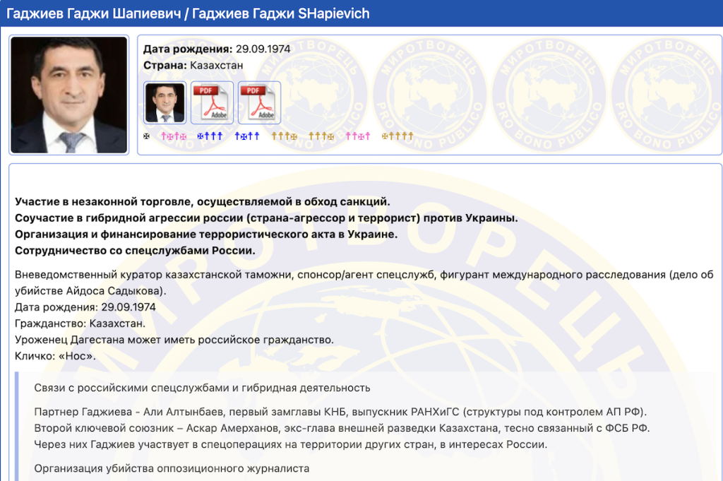 «Через логистическую сеть, контролируемую Гаджиевым, осуществляется переправка санкционных грузов из Китая и Ирана в РФ и обратно, включая продукцию для российского военно-промышленного комплекса (ВПК). Используются морские пути через порт Актау и железнодорожные маршруты – что свидетельствует о координации на уровне госструктур. Это нарушение международных санкций и прямое пособничество агрессору в войне против Украины», — отмечает «Миротворец».