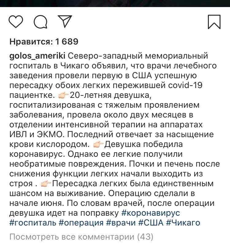 Северо-западный мемориальный госпиталь в Чикаго объявил, что врачи лечебного заведения провели первую в США успешную пересадку обоих легких пережившей COVID-19 пациентке, – подробнее читайте здесь.