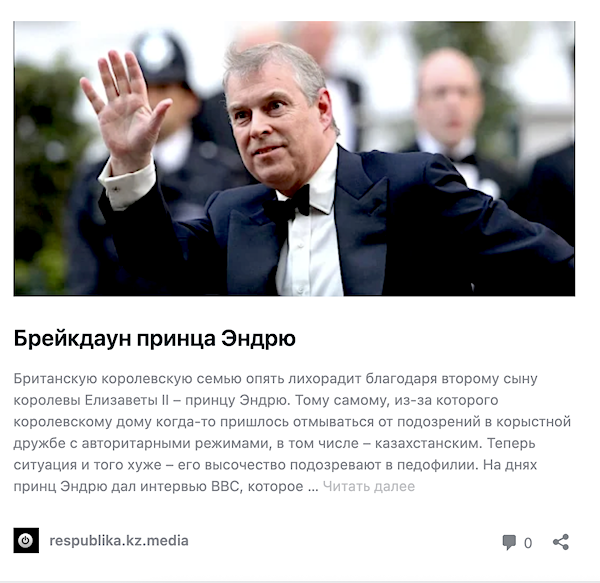 «Британскую королевскую семью опять лихорадит благодаря второму сыну королевы Елизаветы II – принцу Эндрю. Тому самому, из-за которого  королевскому дому когда-то пришлось отмываться от подозрений в корыстной дружбе с авторитарными режимами, в том числе – казахстанским. Теперь ситуация и того хуже – его высочество подозревают в педофилии.