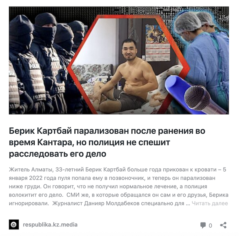 В 2023 году в «Республике» опубликовали историю о Берике Картбае — алматинце, которого парализовало ниже пояса в результате пулевого ранения, полученного им около резиденции президента.