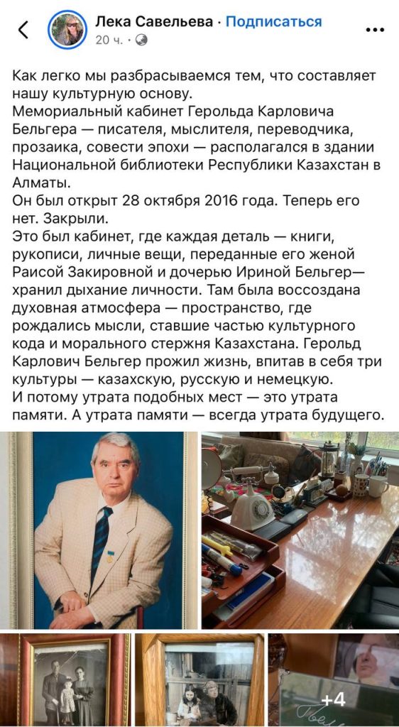 «Как легко мы разбрасываемся тем, что составляет нашу культурную основу. Мемориальный кабинет Герольда Карловича Бельгера — писателя, мыслителя, переводчика, прозаика, совести эпохи — располагался в здании Национальной библиотеки Республики Казахстан в Алматы.Он был открыт 28 октября 2016 года. Теперь его нет. Закрыли».