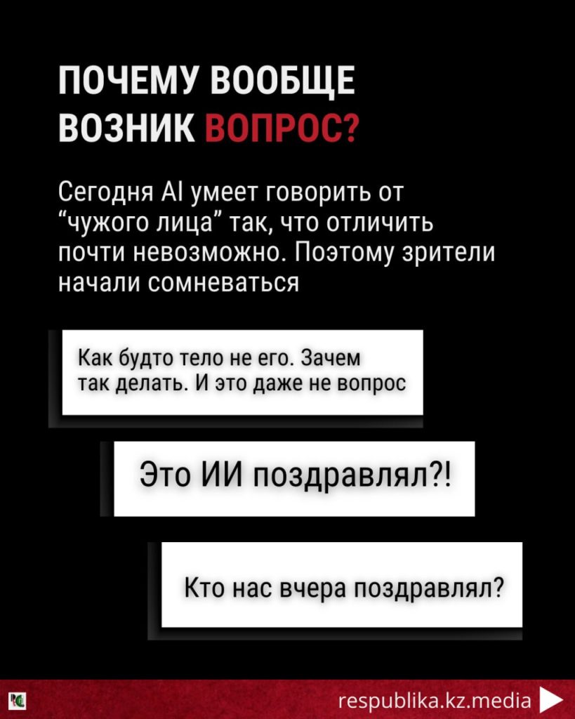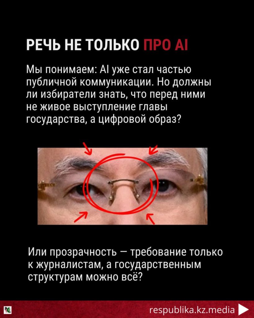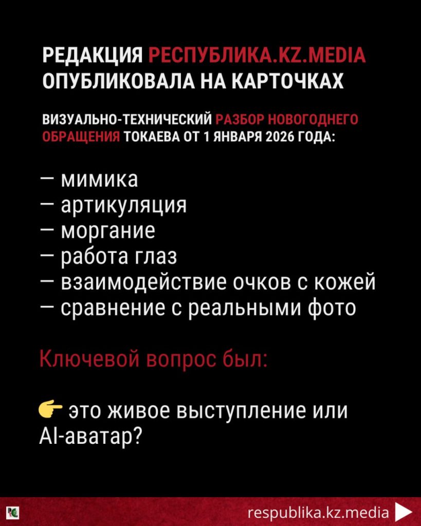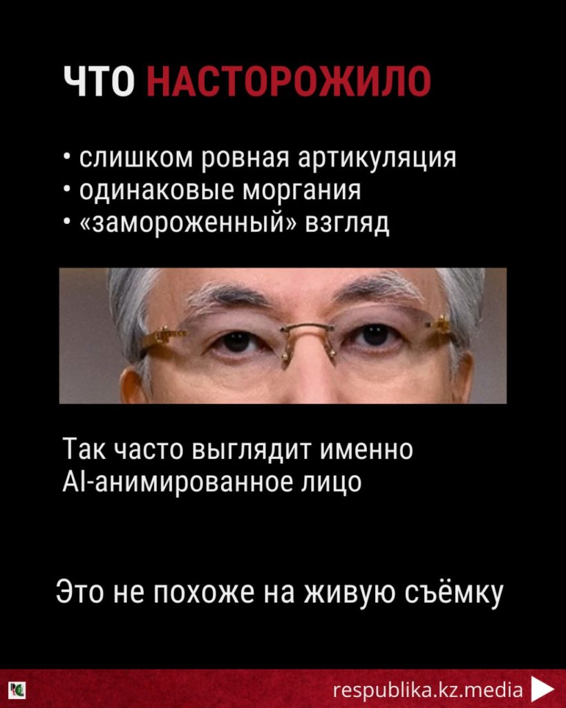 При этом мы не утверждали, что обращение Токаева является фейком. Речь идёт исключительно о визуально-техническом анализе видеоряда, то есть о том, как именно было создано видео — живая съёмка или AI-ассистированный формат.