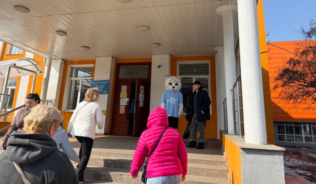 На крыльце перед входом в избирательный участок местных жителей встречает барс-агитатор в голубой футболке с надписью: «Мен референдумға келдiм».