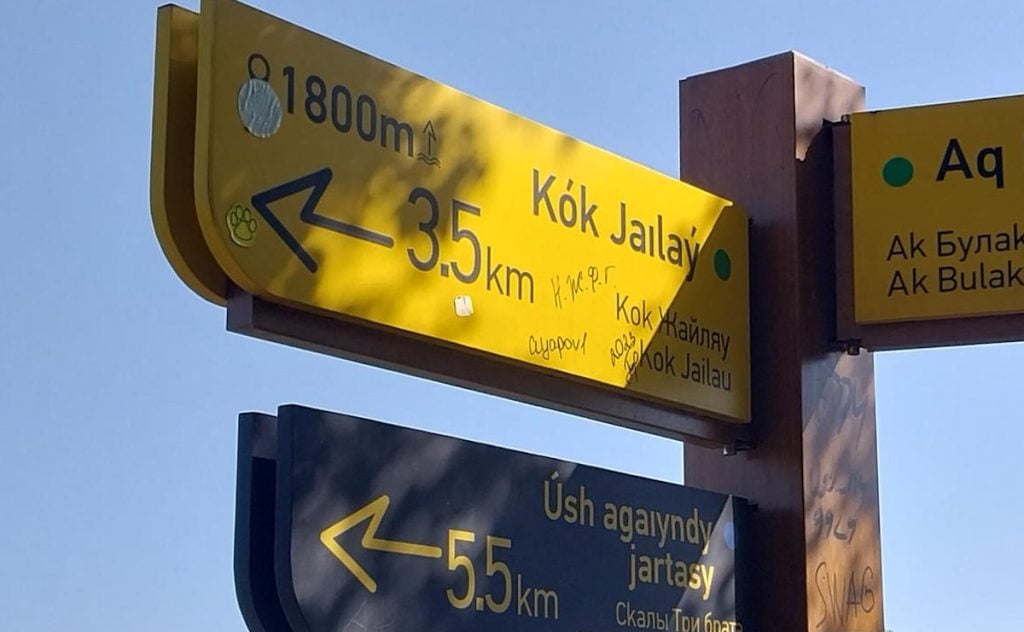 Когда неподготовленный, вроде меня, турист пересиливает желание сбежать обратно в город и поднимается по первому склону, перед ним открывается живописная панорама Алматы. Из земли торчит табличка с указанием длины маршрута и исписанная именами тех, кто ходил здесь раньше.