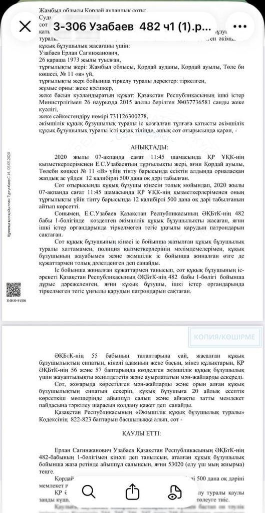 Несмотря на то, что обыск проводили сотрудники аж целого КНБ, все кончилось лишь административным делом. Узабаева признали виновным по части 1 статьи 482 Кодекса об административных правонарушениях и оштрафовали на 53 тысячи тенге. Суд проходил там же, в Кордае.