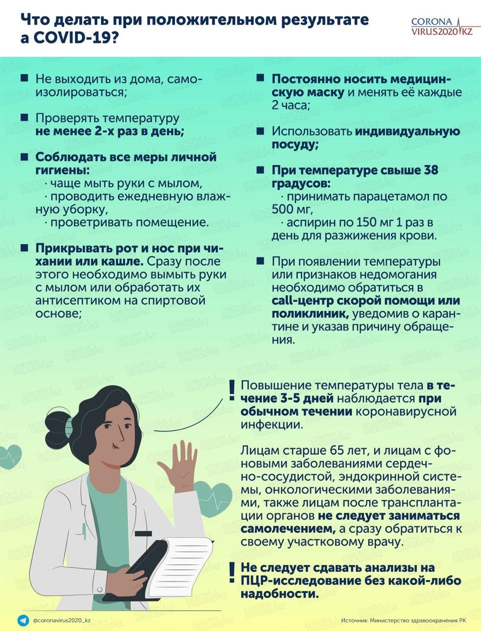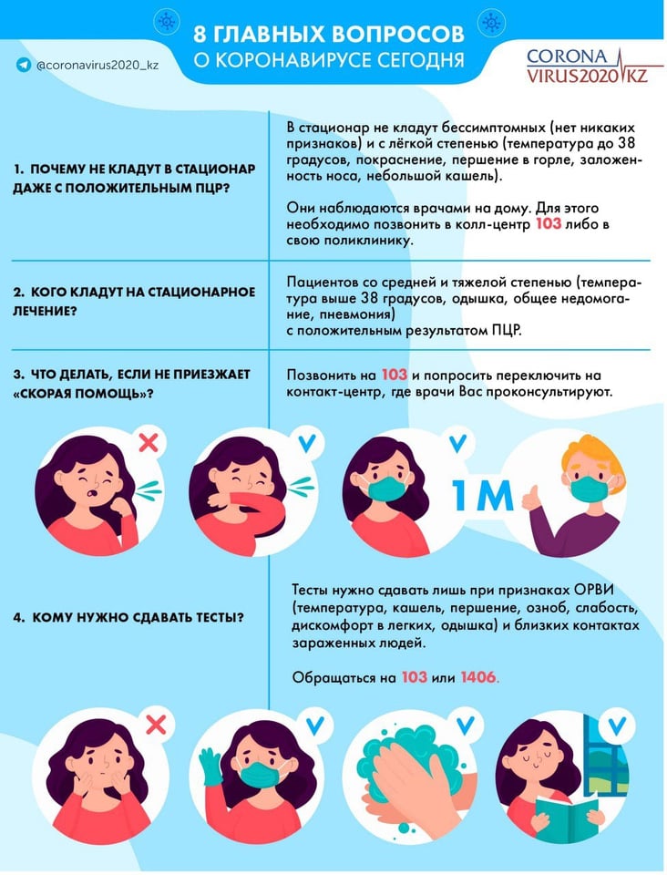 На сайте Министерства здравоохранения есть ролик, как защитить себя и близких от COVID-19, вот только звонить в «скорую» при первых симптомах вируса сейчас бессмысленно. Вчера ведущий инфекционист Казахстана Динагуль Баяшева заявила: «От того, что будешь кричать — у меня коронавирус, никто не примет срочных мер и не прибежит к вам. Вы должны это понимать уважаемые казахстанцы. Потому что количество больных увеличилось». Так что сегодня, большинство из нас должны сами заботиться о себе и близких. Благо для нас подготовлены инструкции!