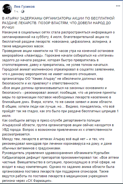 В Атырау задержаны организаторы акции по бесплатной раздаче лекарств. Об этом в Facebook сообщил журналист Лев Гузиков.