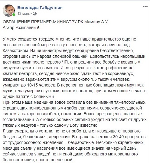«Точка невозврата близка!» Публицист Бигельды Габдуллин обратился через соцсети премьер-министру РК. «Ваши министры ведут себя крайне безответственно, огородившись от народа слоновой башней. Довольствуясь небольшими достижениями после первого ЧП, они решили все борьбу с коварным вирусом пустить на самотек», — отметил он.