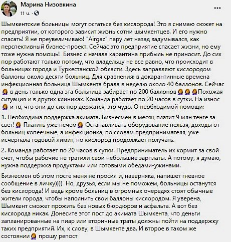 Предприятию «Airgaz», занимающееся заправкой кислородом баллонов для больниц, нечем платить за свет, коллектив трудится по 20 часов в сутки. А кислорода нужно все больше и больше. В докарантинные времена одна только шымкентская инфекционная больница брала около 40 баллонов в неделю. Сейчас за один день — 200 баллонов! У второго местного поставщика кислорода такая же ситуация, бьет тревогу шымкентская журналистка Марина Низовкина.