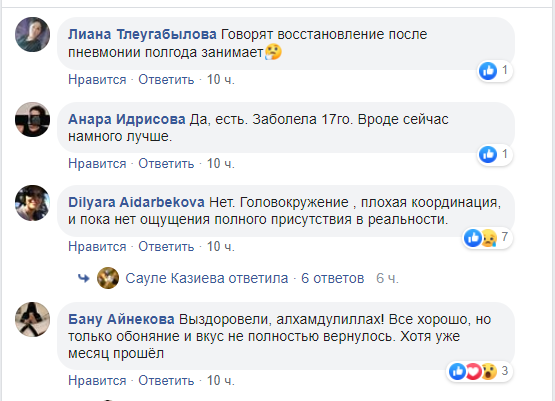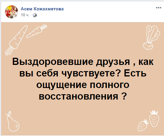Вчера в «Фейсбуке» наткнулась на пост Асем Кожахметовой, где она задала своим друзьям вопрос: «Выздоровевшие друзья, как вы себя чувствуете? Есть ощущение полного восстановления?» под постом около ста комментариев, в них многие говорят что говорить о полном восстановлении пока рано. У многих осталась слабость, кашель, потливость и даже температура.