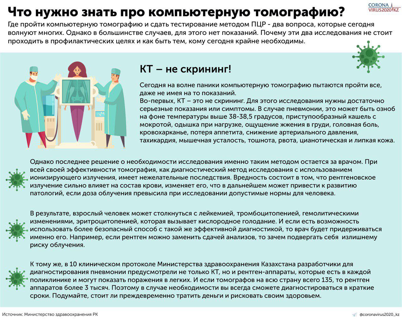 Очередную порцию инфографики выпустил Минздрав РК. В картинках рассказывают про компьютерную томографию и ПЦР-тестирование.