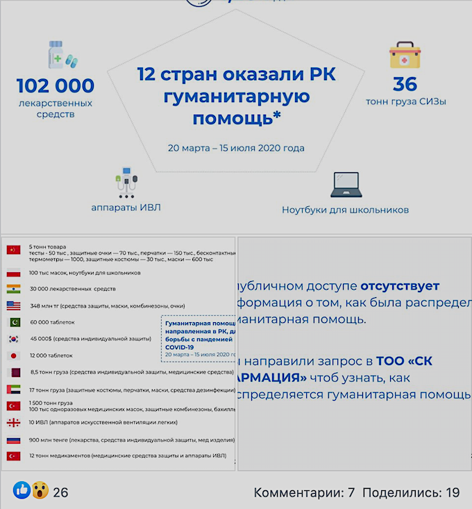 Куда девалась гуманитарка? 12 стран направили в Казахстан гуманитарную помощь для борьбы с COVID-19 в период с апреля по настоящее время, сообщает фонд Zertteu Research Institute. Как известно, ТОО «СК-Фармация» — единственная уполномоченная организация по распределению гуманитарной помощи.