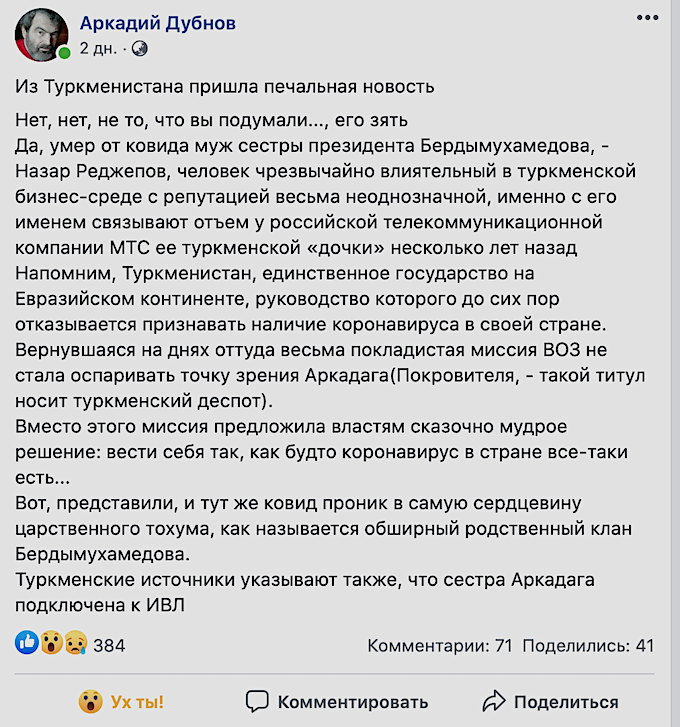 В Туркменистане от ковид умер муж сестры президента страны Гурбангулы Бердымухамедова — Аннаназар Реджепов. А сама сестра президента подключена к ИВЛ, — написал известный российский политолог и эксперт по Центральной Азии Аркадий Дубнов на своей странице в Facebook, ссылаясь на свои источники. По некоторым данным, зять Аркадага — Аннаназар Реджепов вместе со своим сыном Хаджимурадом контролировал ряд компаний, владеющих лучшими административными, торговыми и производственными площадями по всей стране.