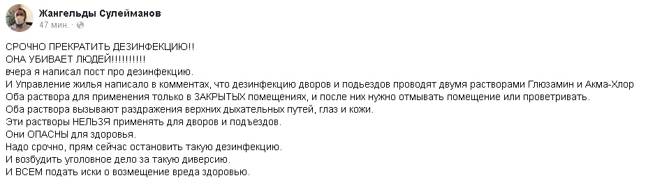 «СРОЧНО ПРЕКРАТИТЬ ДЕЗИНФЕКЦИЮ!! ОНА УБИВАЕТ ЛЮДЕЙ!!!!!!!!!!» — такое сообщение появилось на личной странице в Fecebook алматинского адвоката Жангельды Сулейманова. Он сообщает о том, что дезинфекцию дворов и подъездов проводят двумя растворами Глюзамин и Акма-Хлор. Оба раствора вызывают раздражения верхних дыхательных путей, глаз и кожи. Эти растворы нельзя применять для дворов и подъездов. Они опасны для здоровья. Для увеличения картинки, просто нажмите неё.
