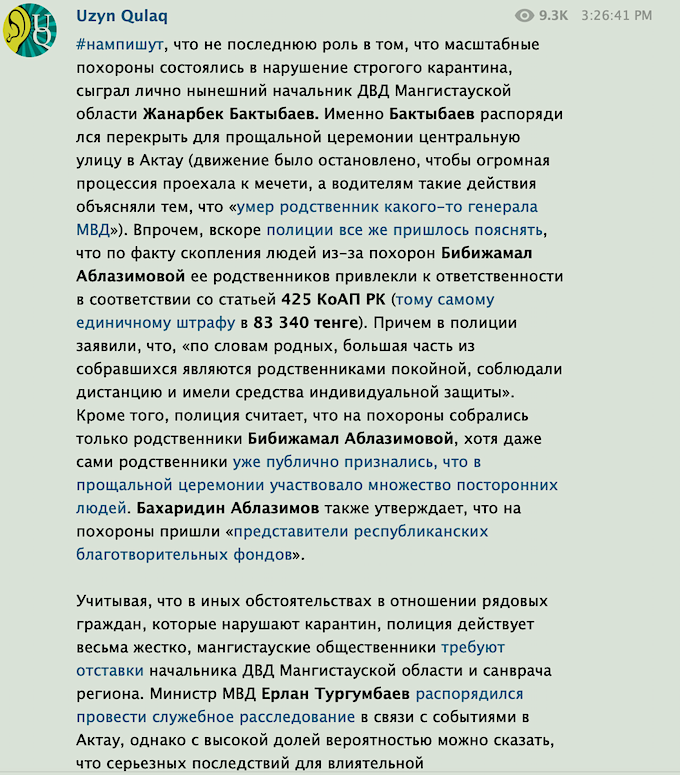 Именно Бактыбаев распорядился перекрыть для прощальной церемонии центральную улицу в Актау (движение было остановлено, чтобы огромная процессия проехала к мечети, а водителям такие действия объясняли тем, что «умер родственник какого-то генерала МВД»). Впрочем, вскоре полиции все же пришлось пояснять, что по факту скопления людей из-за похорон Бибижамал Аблазимовой ее родственников привлекли к ответственности в соответствии со статьей 425 КоАП РК (тому самому единичному штрафу в 83 340 тенге). Причем в полиции заявили, что, «по словам родных, большая часть из собравшихся являются родственниками покойной, соблюдали дистанцию и имели средства индивидуальной защиты». Кроме того, полиция считает, что на похороны собрались только родственники Бибижамал Аблазимовой, хотя даже сами родственники уже публично признались, что в прощальной церемонии участвовало множество посторонних людей. Бахаридин Аблазимов также утверждает, что на похороны пришли «представители республиканских благотворительных фондов».