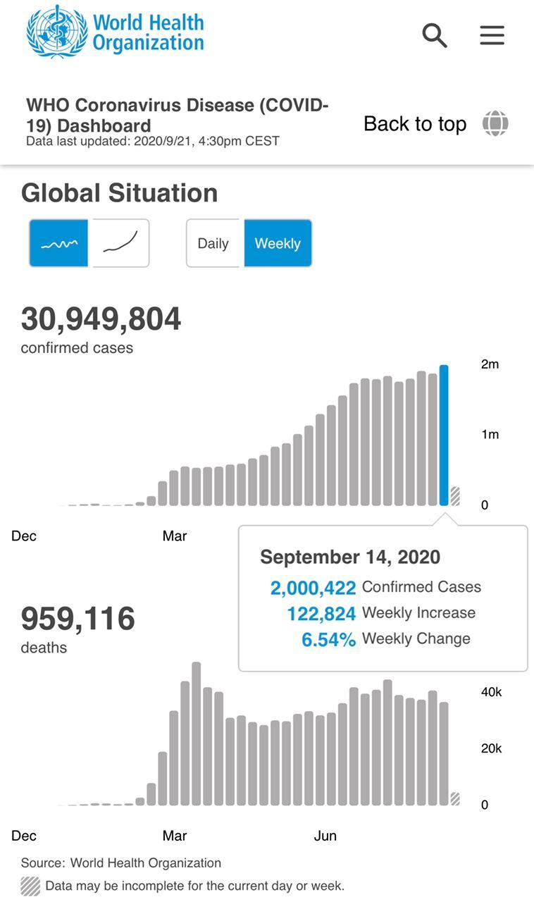 Ситуация в мире. По данным Всемирной организации здравоохранения, число зараженных коронавирусной инфекцией в мире превысило 30,9 млн, из них более 959 тыс. умерли. Согласно актуальным данным Университета Джонса Хопкинса, в мире заразились более 30,44 млн человек, из них 963 тыс. скончались.