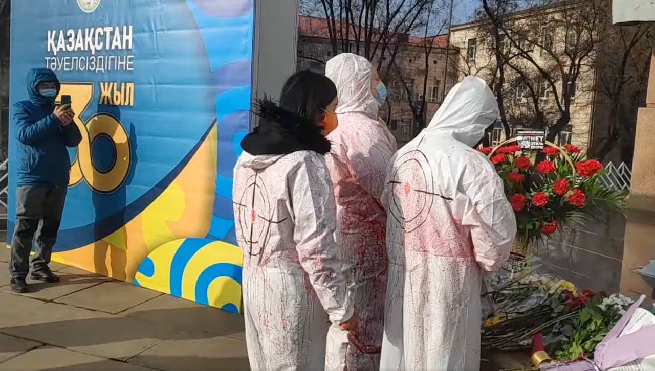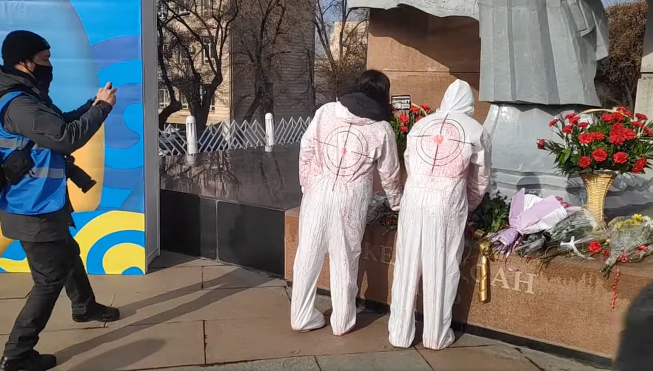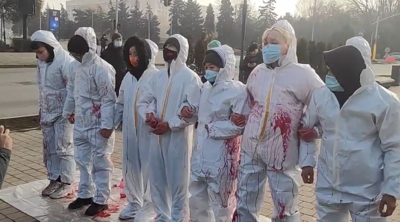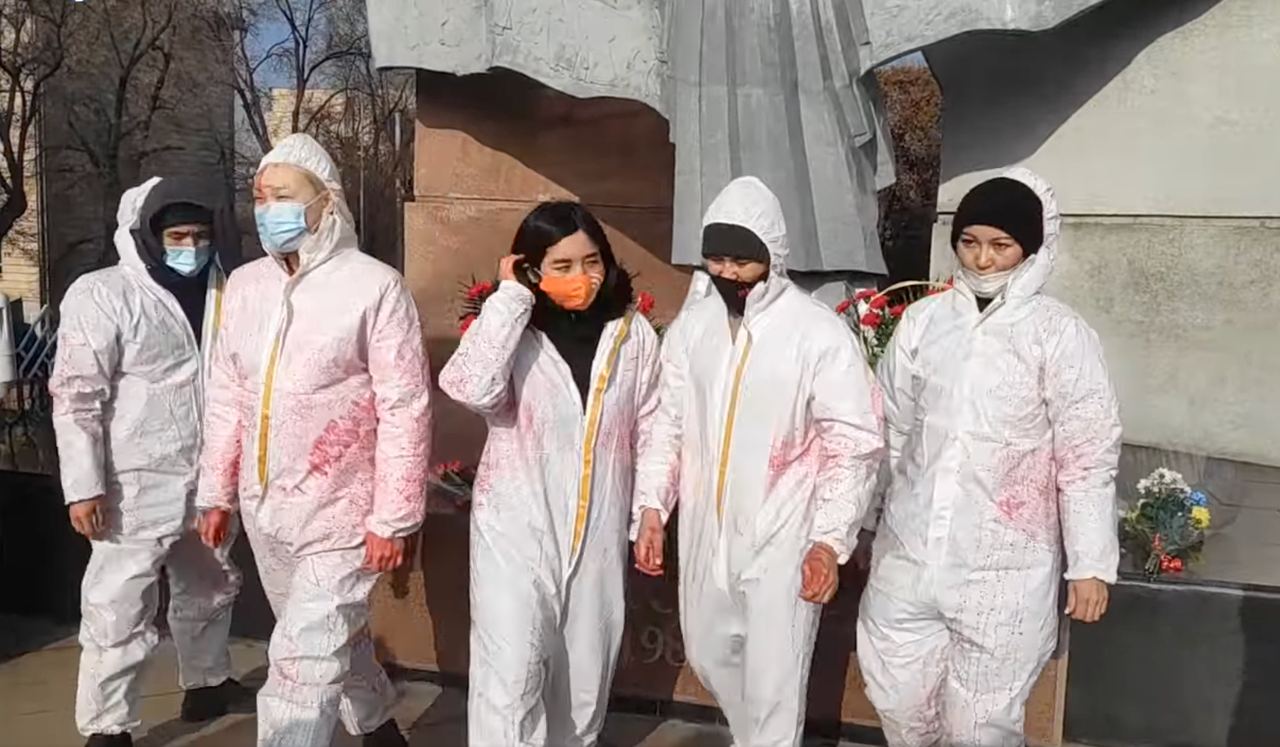 Молодые люди облачились в белые рабочие костюмы, символизирующие законопослушных мирных граждан Казахстана, а затем облились красной краской, символизирующей пролитую кровь казахстанцев.