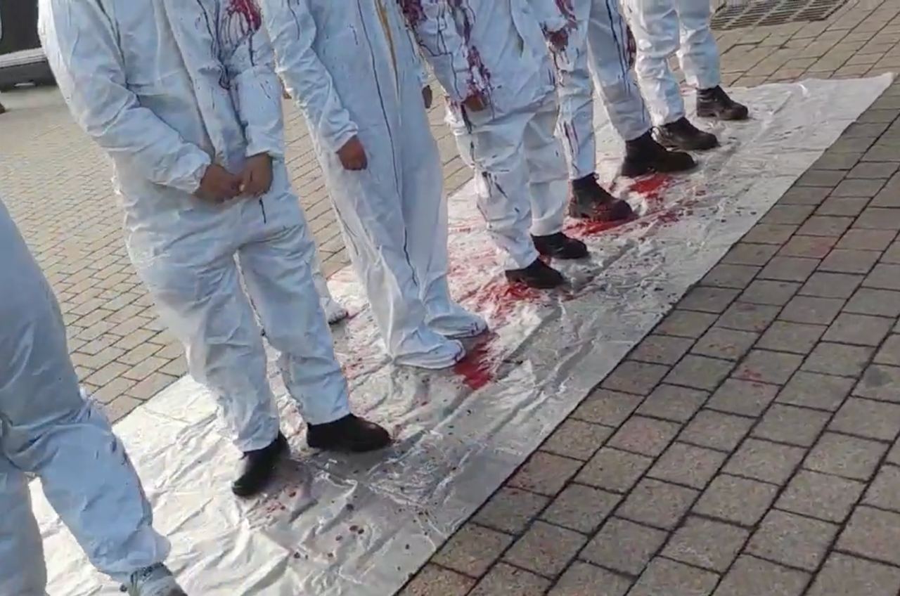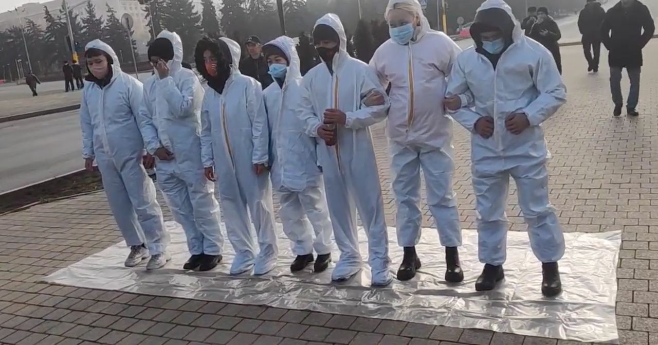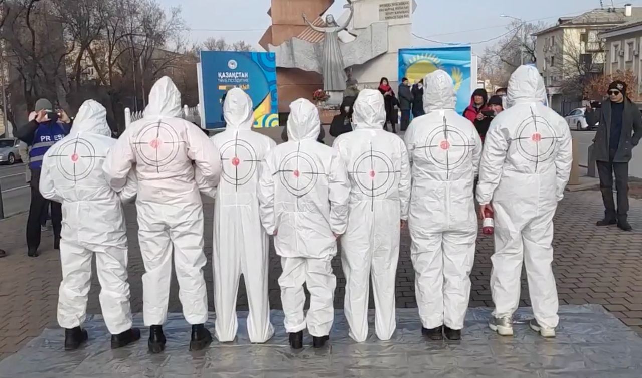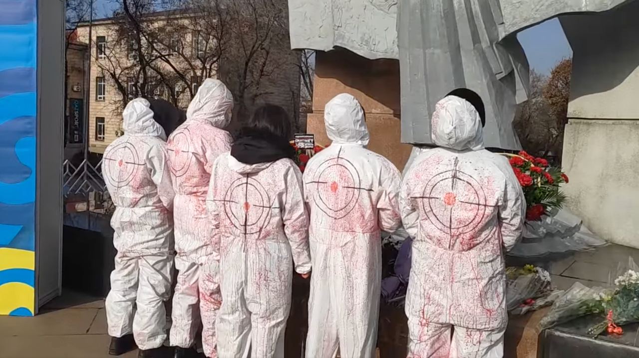 Молодые люди облачились в белые рабочие костюмы, символизирующие законопослушных мирных граждан Казахстана, а затем облились красной краской, символизирующей пролитую кровь казахстанцев.