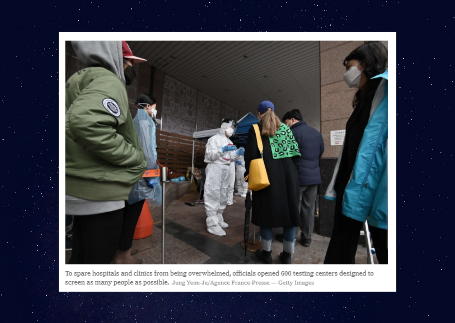 За день Южная Корея может тестировать до 20 000 человек. Чтобы снять повышенную нагрузку на больницы, в стране было создано 633 центра, предназначенных только для тестирования, включая 50 станций на парковках, в которых люди могут пройти тест, не покидая своих автомобилей.